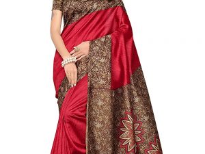 Oomph! Women’s Art Silk Printed Kalamkari Sarees with Tassles – Crimson Red & Hickory Brown