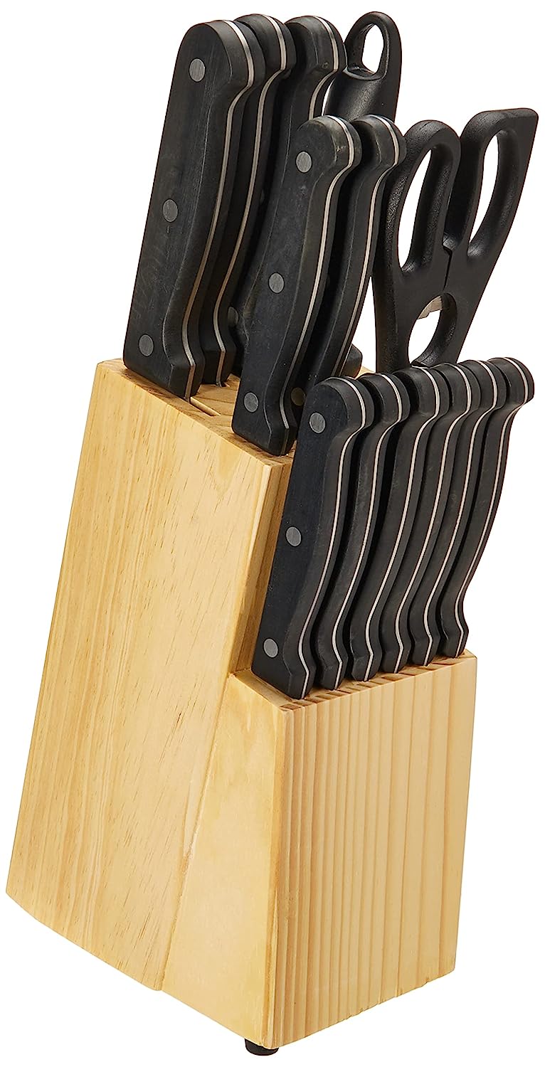 AmazonBasicsStainlessSteelKnifeSetwithHigh-CarbonBladesandPineWoodBlock,14Pieces