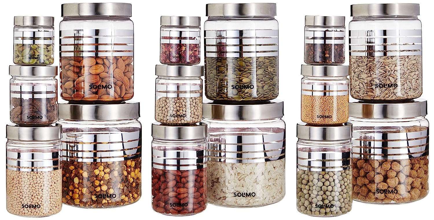 AmazonBrand-SolimoPlasticContainerSet,15-Pieces,SilverwithStainlessSteelLid&WideMouth