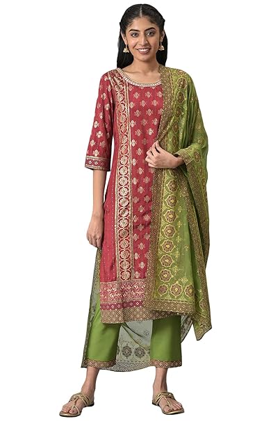 Aurelia Women Rayon Red Foil Printed Kurta With Green Kurta Trouser With Dupatta Set